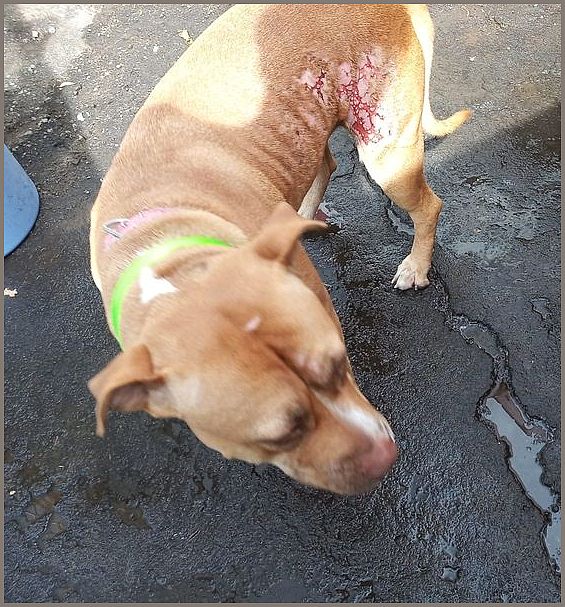 Die nächste Hündin wurde aufgefunden, nicht gechipt, scheint besitzerlos. Sie ist blind und hat Verletzungen die von Misshandlungen stammen und auch von ausgedrückten Zigaretten auf ihrem Körper. Sie ist sehr lieb. Sie konnte nicht in einer Box untergebracht werden da sie in der Box ständig hochgesprungen ist, mit dem Rücken gegen die Decke. Deshalb wurde sie an einer Kette festgemacht.