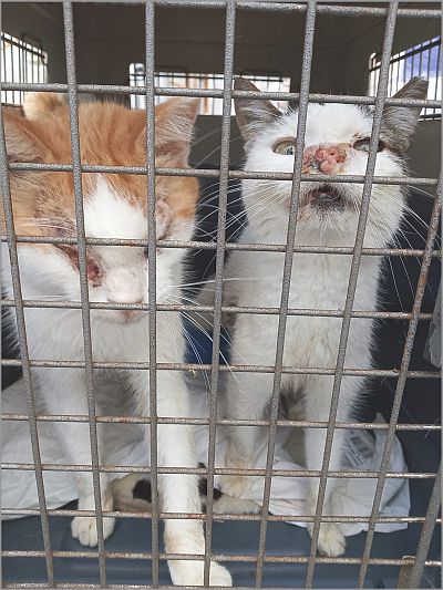 Diese beiden Katzen lebten auf der Strasse in einer Gruppe, wurden aufgenommen, untersucht und wenn sie gesund sind, werden sie kastriert, damit sie später wieder mit ihrer Kolonie zusammen draussen leben können.