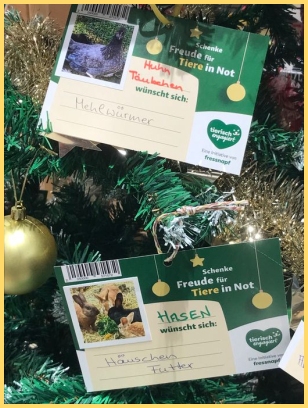 Wir dürfen dieses Jahr wieder Wünsche für die Tiere am Wunschbaum im Fressnapf anbringen.